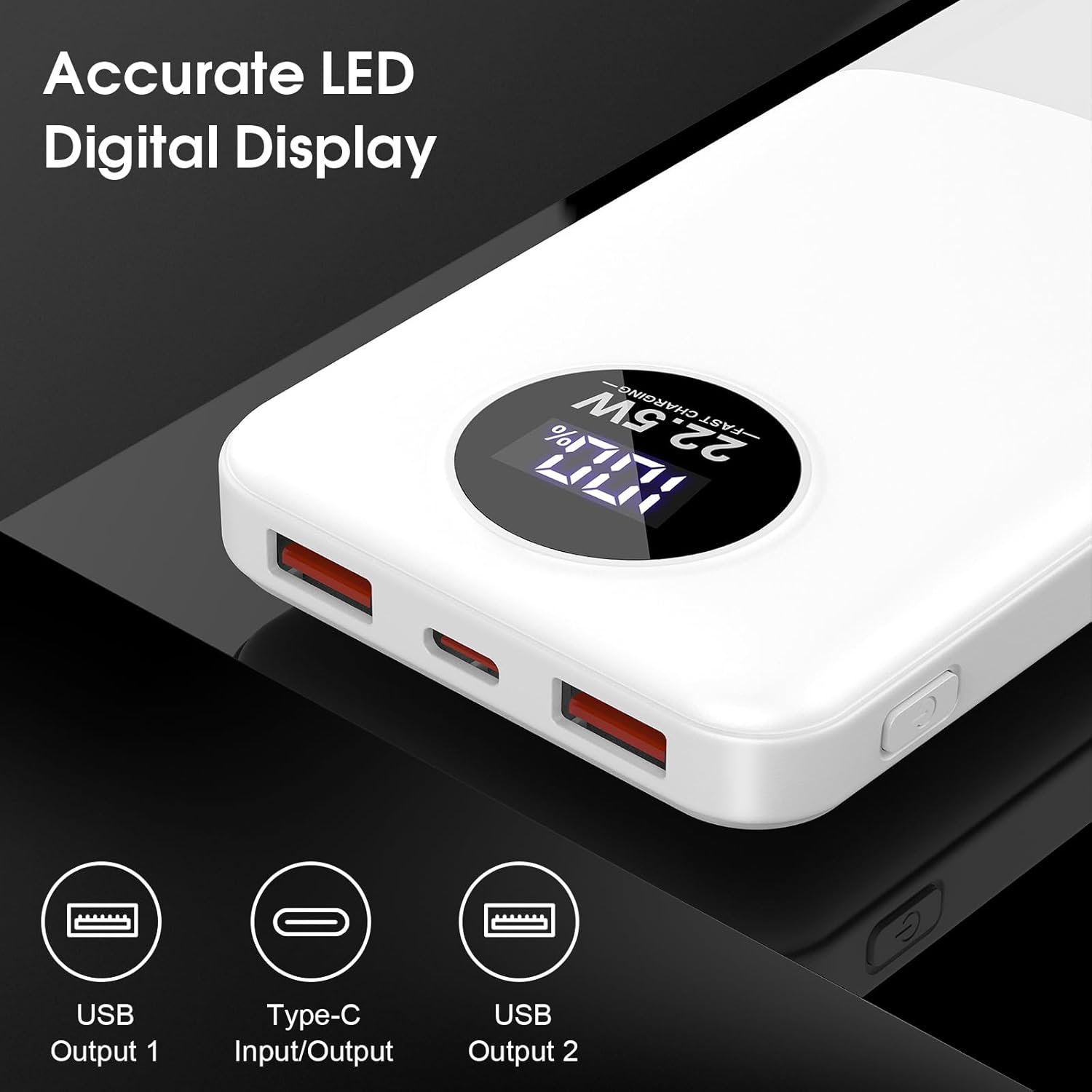 Dbasne Portable Charger, 22.5W Slim Power Bank 10000mAh USB C in & Out, PD QC4.0 LED Display Battery Pack, Power Bank Fast Charging Compatible with iPhone 16 15 14 13 Pro Max iPad Google etc White